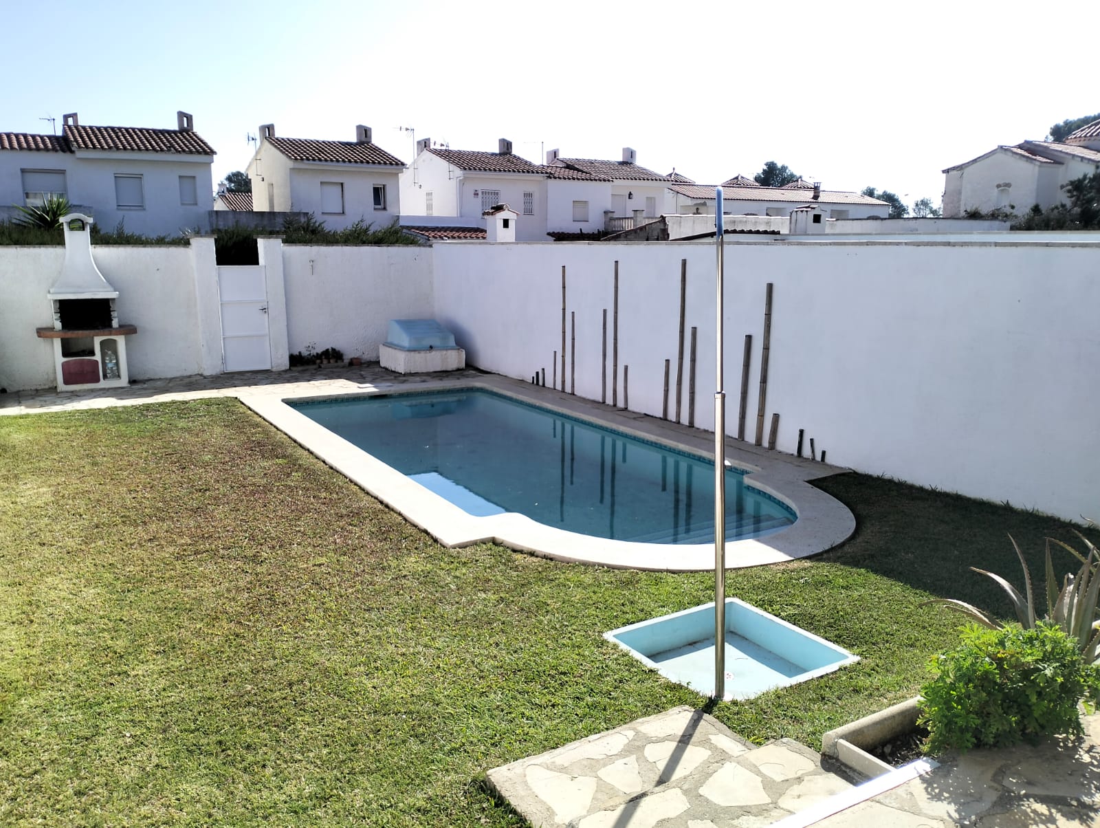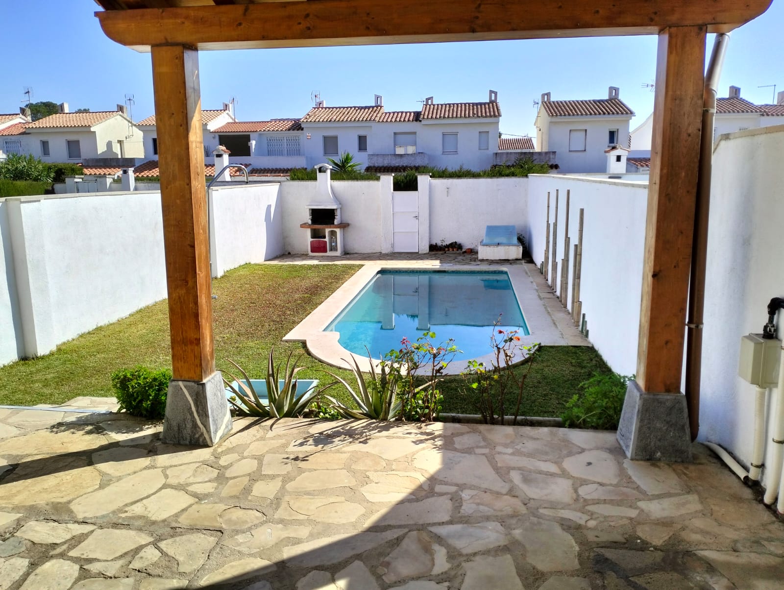 À l’extérieur, un agréable espace privé avec jardin, piscine et barbecue, parfait pour profiter toute l’année. La propriété dispose également d’un garage.
